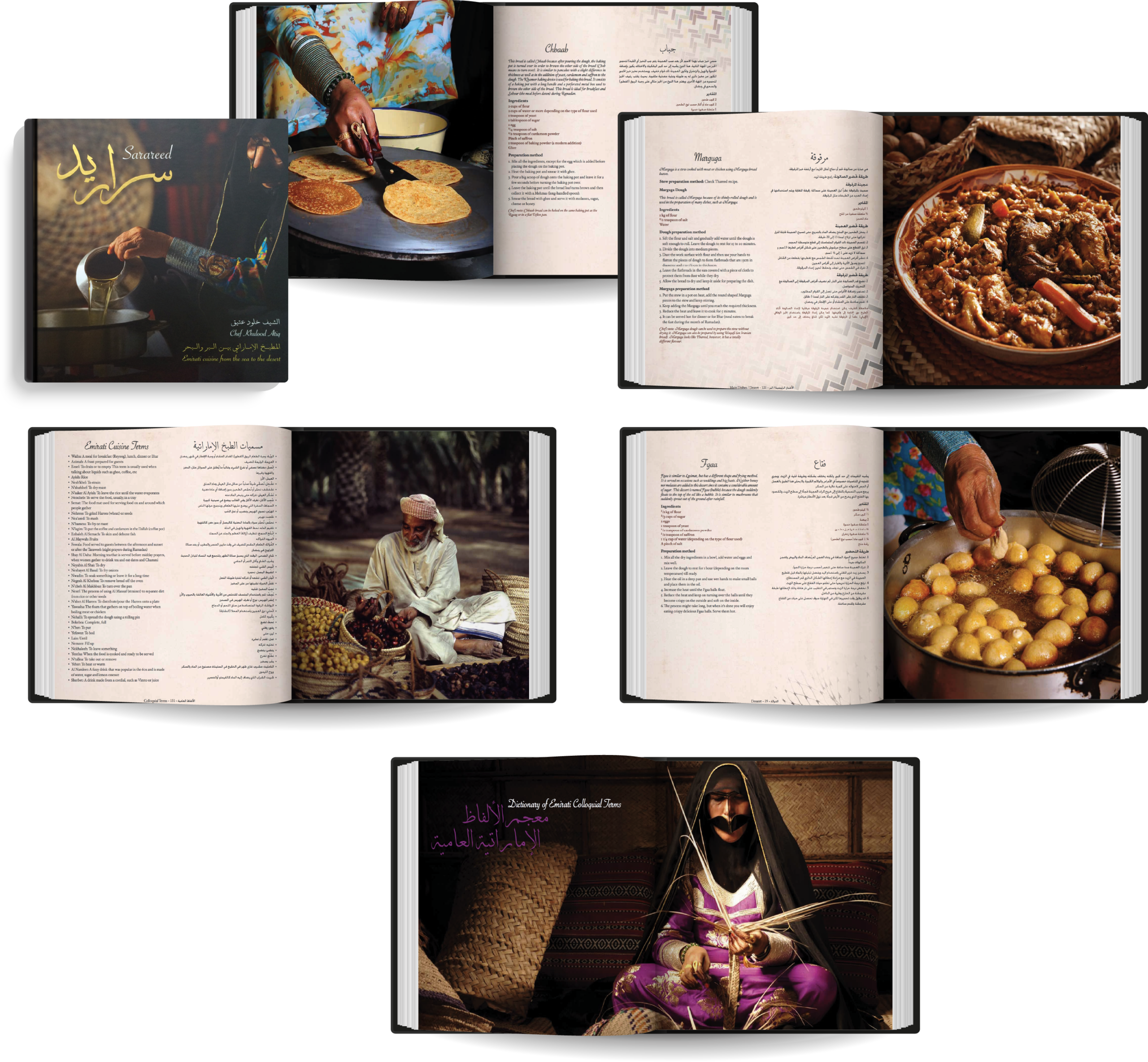 نقدم خدمة إعداد الكتب للمؤسسات، أعدادنا كتاب الطبخ الإماراتي “سراريد” سردنا الوصفات الإماراتية للمأكولات والمشروبات والحلويات وأنواع الخبز التقليدية، إضافة إلى السلطات وأطباق الحساء، والبهارات، والأطباق الرئيسية، والكشف عن طرق تقديمها مع تسليط الضوء على التراث الإماراتي والأسماء التراثية للمطبخ الإماراتي وتقاليد الضيافة الإماراتية. والبحث عن الوصفات الإماراتية للمأكولات والمشروبات والحلويات وأنواع الخبز التقليدية، إضافة إلى السلطات وأطباق الحساء، والبهارات، والأطباق الرئيسية، والكشف عن طرق تقديمها مع تسليط الضوء على التراث الإماراتي والأسماء التراثية للمطبخ الإماراتي وتقاليد الضيافة الإماراتية وتقاليد الضيافة الإماراتية الغنية. قمنا بصياغة محتوى باللغتين العربية والإنجليزية للكتاب من خلال التواصل مع أول شيف إماراتي تعمل في فنادق الجميرا خلود عتيق التي قدمت وصفات أصلية قمنا بكتابتها لتصطف داخل كتاب، وترافق ذلك مع بحث مكثف عن أسماء الأواني وأصول الضيافة الإماراتية واعتمدنا على اللهجة والمصطلحات الإماراتية في المحتوى العربي، وتم سرد الوصفات الشعبية العريقة والتراث الإماراتي الأصيل في إعداد وتقديم الطعام وطرق استقبال الضيوف التي تميزت بالكرم والترحاب. كما خصصنا قسماً للمصطلحات الإماراتية العامية التي تثري معرفة القارئ بالثقافة الإماراتية.